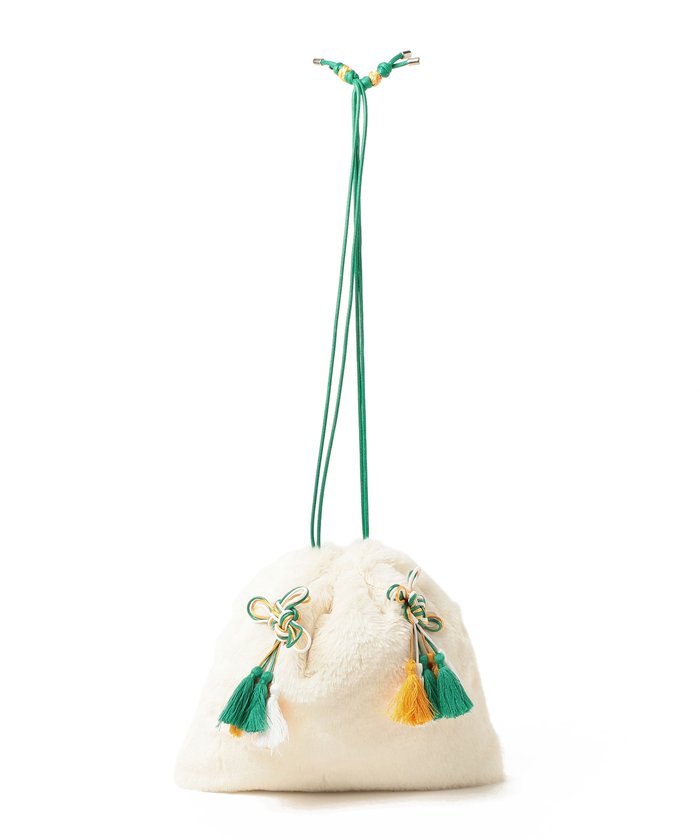 秋冬マストのボア素材を使用した巾着シルエットのカジュアルバッグ。カラフルな組み紐がポイントです。