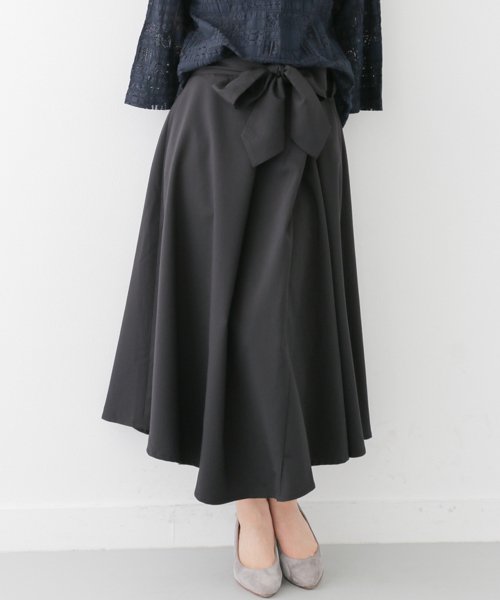 ウエストマークになるリボンベルト付きのスカート。ふわりと踊る生地感とアシメトリーな丈で歩くたびに動きのある表情を見せてくれます。大人っぽさのあるミモレ丈で、ヌケ感のあるブラウスなどちょっと隙のある着こなしがポイント。