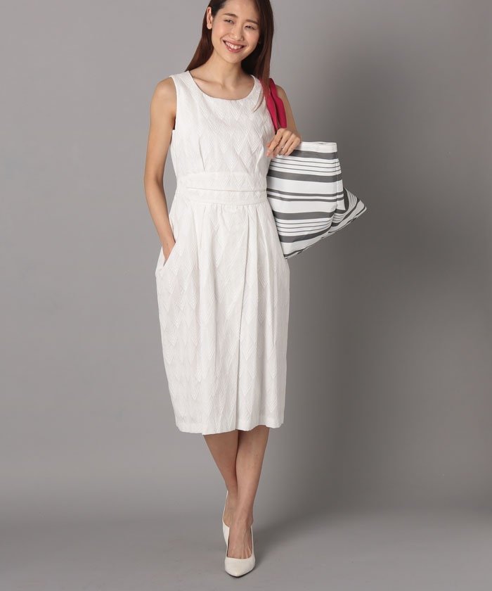 大ぶりのヘリンボーン柄をベースと同色の刺繍で表現した、やりすぎ感を抑えつつ技ありなルックスに仕上げたノースリーブワンピース。スカート部分にはふっくらとふくらみを持たせているから、メリハリも◎。