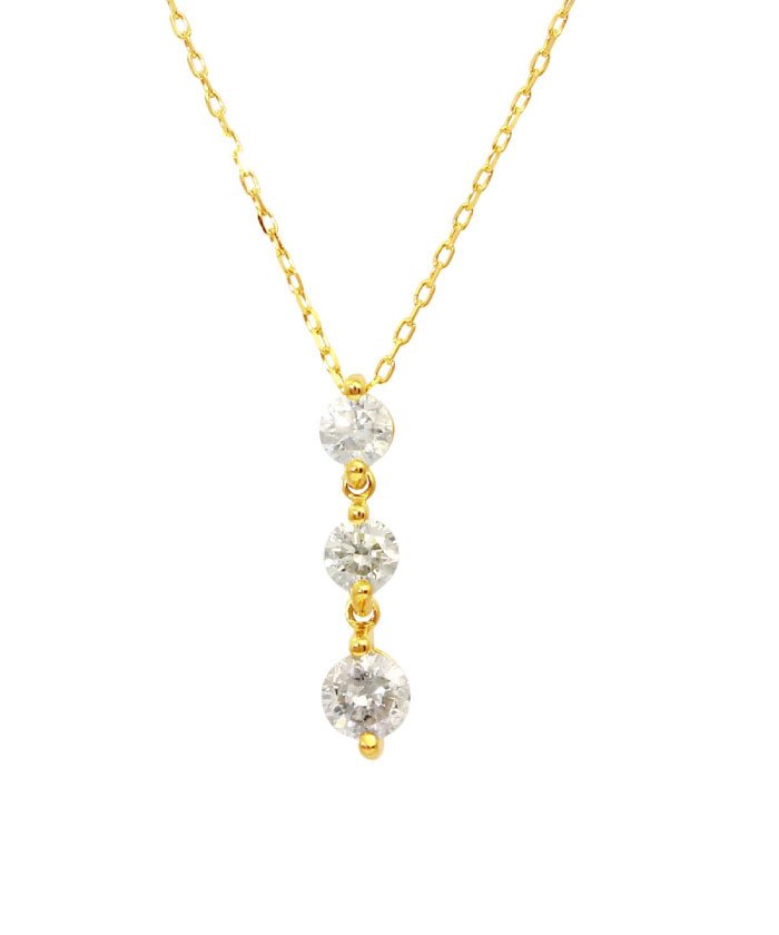「過去・現在・未来・・・」を表現するダイヤモンドジュエリー定番の人気を誇る3ストーンネックレス。いつの時代も良いものは変わらず形を残すジュエリーの定番といっても過言ではないスリーストーンネックレス。3石の天然ダイヤモンドが胸元で優雅に揺れる大人の女性に相応しいペンダントネックレスです。合計0.3ctの天然ダイヤモンドに地金は贅沢な18金ゴールド!チェーンもK18ゴールドでシンプルなあずきチェーン40cm!定番のホワイトゴールド、フェミニンなピンクゴールド、ゴージャスなイエローゴールドの3カラーからお選びいただけます。エレガントな輝きをいつまでも楽しめるおすすめのペンダントネックレス。ファッションやシーン、年代を問わない普遍的なデザインは幅広い層から支持される一生モノのアイテムです。ご自身へのご褒美はもちろん大切な方へのプレゼントギフトにも大変おすすめな定番ダイヤモンドジュエリーです。