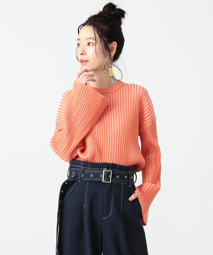 Ray BEAMS / リブ フレアースリーブ クルーネック