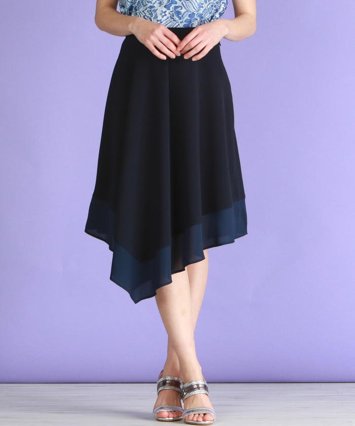 裾の異素材使いとイレギュラーなヘムラインが印象的なフレアスカート。マットな中肉のダブルクロス素材をベースに、シフォンを裾に用いた異素材デザインが個性的で◎。裾の異素材使いはいやらしくない程よい透け感が爽やかでワンポイントに。丈感は少し長めにお作りしているのでトレンド感もあり、また形の美しさと明るめのカラーは配色が甘くなりすぎずVICKYらしい一着です。