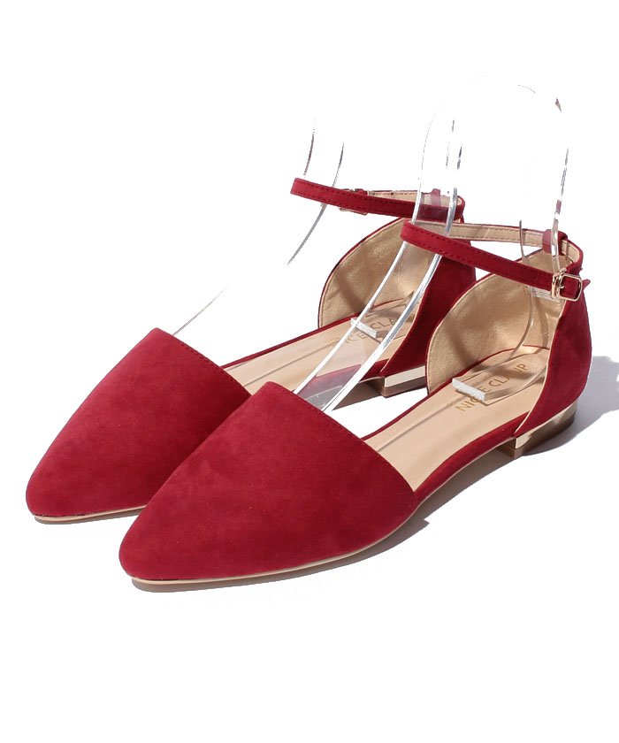 フラットなデザインが歩きやすさ◎なアンクルストラップサンダル。スエード調の滑らかなアッパー、ポインテッドトゥがエレガントに装えるアイテムです。