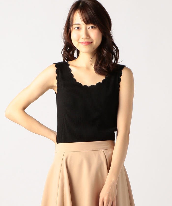 襟ぐりや肩まわりをスカラップデザインにしたフェミニンなタンクトップです。フィット感良く着られるリブ素材であわせるトップスにひびきません。ベーシックを押さえた豊富なカラバリで、色違いでも欲しくなるアイテムです。
