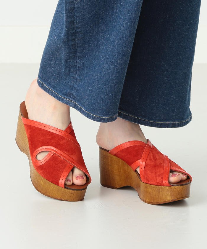スエードのアッパーにレザーのパイピングを施し、メリハリのある印象に。ソール部分はウッドではない合成底を使用し、太めのクロスストラップで安定感のある一足が実現。