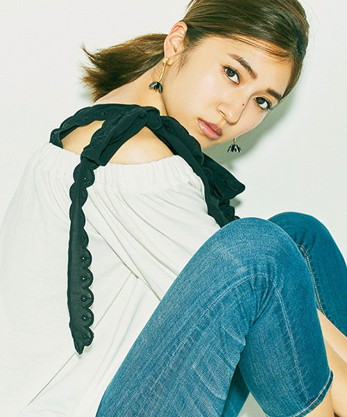 リボンを外すと、印象ががらりと変わり、シンプルなオフショルダーのカットソーに。
