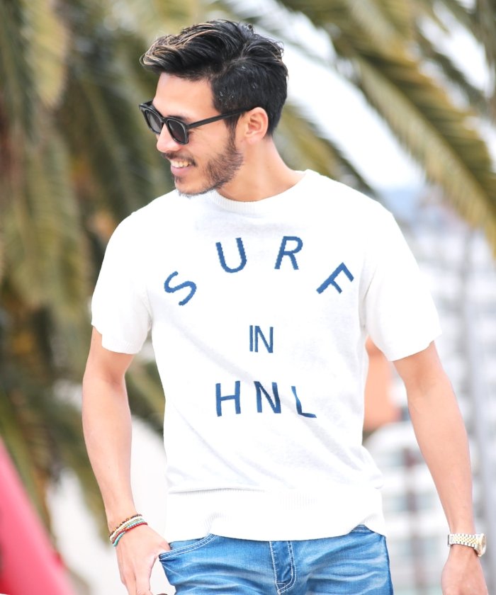 サマーニットとして、Tシャツ感覚で素肌に着ても心地よい風合いを生み出すのは、ソフトな綿/アクリル糸を使用した12ゲージの天竺編み。コットンだけでは作れないドライ感を持ちながらもやさしい風合いが魅力の編地です。