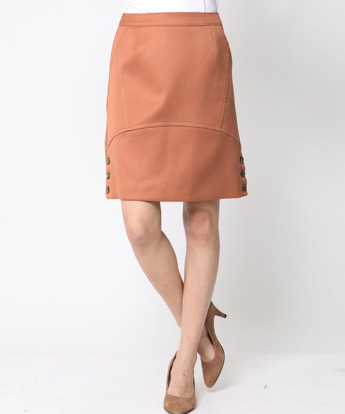 【LOOK BOOOK 9月掲載商品】切り替えデザインとサイドのボタンがポイントの台形ミニスカート。肉感のある二重織りの生地は程よい弾力で構築的なシルエットを演出できます。シワになりにくいのもうれしいポイント!複雑に入れた切り替えはシンプルなデザインに程よいアクセントとなっています。さりげない光沢感もビアッジョブルーらしい華やかさがあって◎!コンパクトなシルエットなのでトップスはざっくりとしたローゲージニットやシャギーニットなどのボリューム感のあるトップスを合わせるのがおすすめ。もちろんフェミニンなブラウス(2613-65159)とあわせて上品レディに着こなしてもGOODです♪どんなトップスにも合わせやすい定番ボトムは一枚あると着回しに便利ですよ!