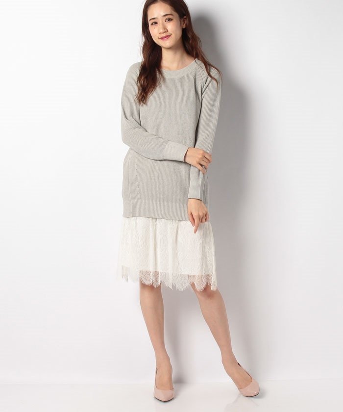 ニットとスカートがセパレートになったワンピース。アクリルとコットンを使ったチュニック丈のニットは、これからの季節にうれしいさらりとした着心地に。動きのある裾のデザインが、抜け感を演出するレースのアンダースカートが、女性らしさを演出します。セパレートになっているので、それぞれ別のアイテムとスタイリングを楽しめるのもうれしいポイント。リラックス感と女性らしさを組み合わせた、LANVIN en Bleuらしいアイテムに仕上がっています。