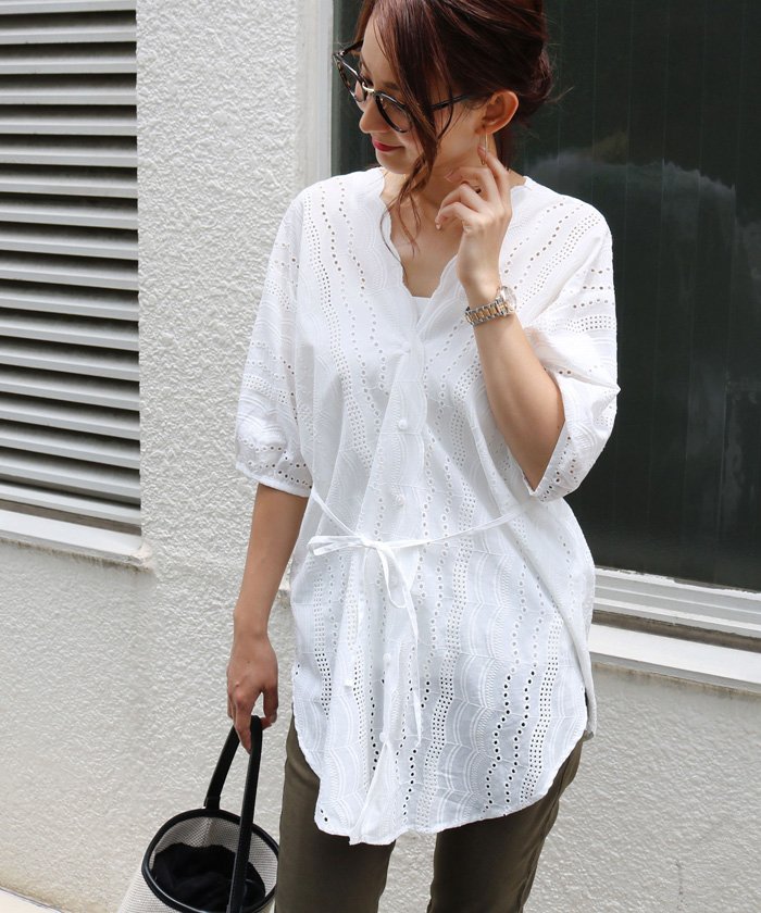 薄手でサラッとした質感が爽やか&心地よい♪ 綿ローン素材を使用したカットワーク レース・ブラウスが入荷しました♪ ふんわりとボリューム感のある5分袖。 ウエスト部分のヒモは取外し可能なので お好みでブラウジングしたり、 そのままサラッと着るもよし。 ヒップを隠してくれるロング丈も嬉しいポイント! フェミニンな印象に見せつつ、楽ちんで 快適に過ごせる万能ブラウスです♪ MODEL:身長158cm MODEL:身長162cm ※撮影時のライティング、ご覧になっているモニター・PC環境により 実際の商品と色味が異なって見える場合がございます。 ご了承の上お買い求め下さい。